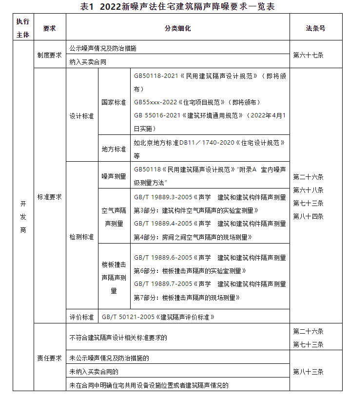 2022新噪声法中,将居住建筑(主要含住宅)列为需要保持安静的噪声敏感建筑物(见第八十八条),并对开发商提出了制度规定可操作性极强的、以隔声降噪标准为依据的、附带有明确法律责任的闭环管理要求,将对法规施行后住宅建筑的声环境保障产生立竿见影的深远影响。表1给出了新噪声法对开发商的具体规定。表2列出了新噪声法住宅建筑隔声降噪相关法条。